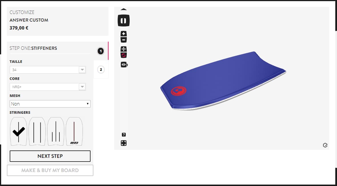 - La Shaping room qui permet de personnaliser sont bodyboard en choisissant le modèle, les côtes, la couleurs, etc...